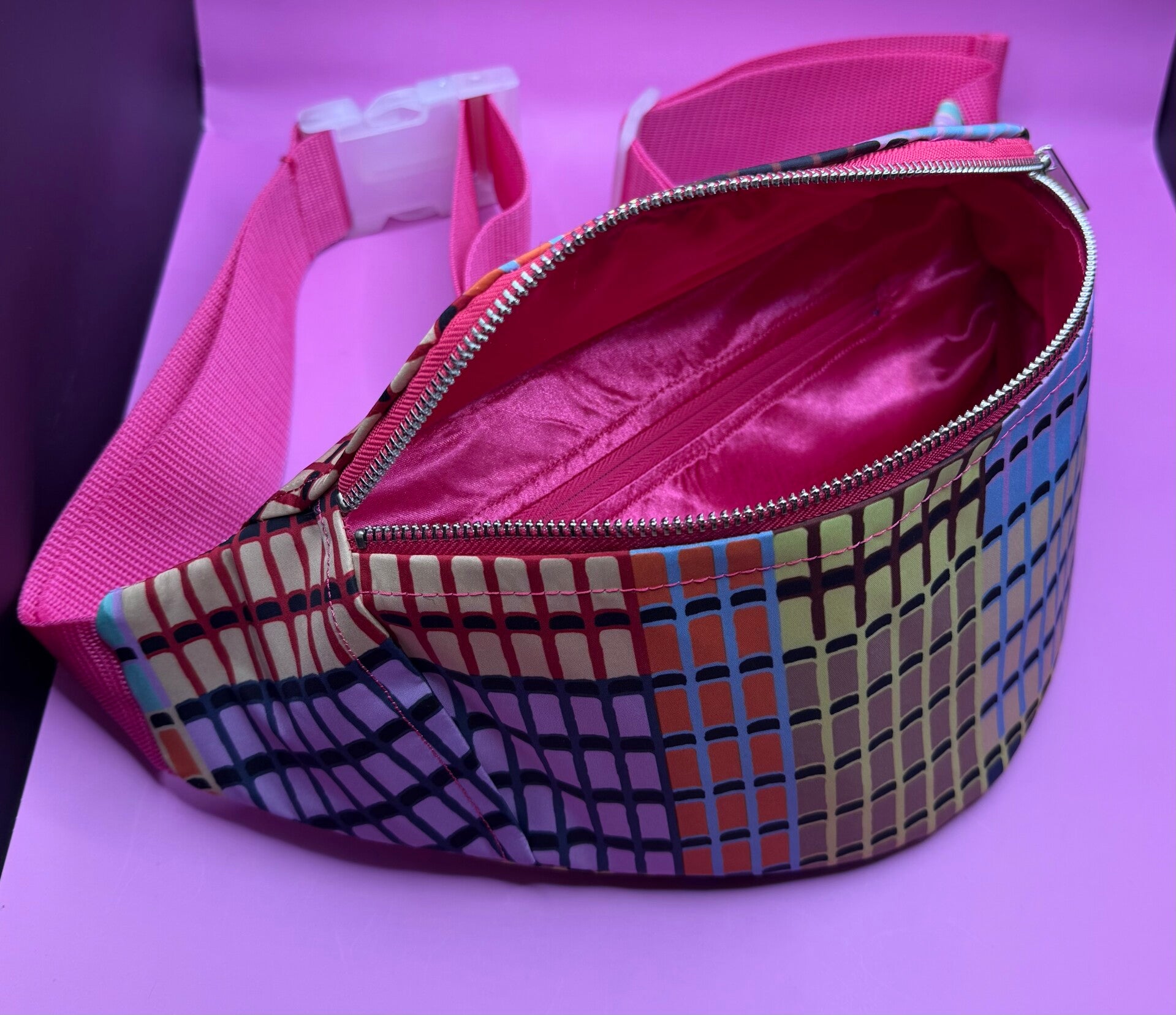 - Insidan prydds av ett cerise foder, innerficka med dragkedja, dubbel fodrad nederkant samt logga.