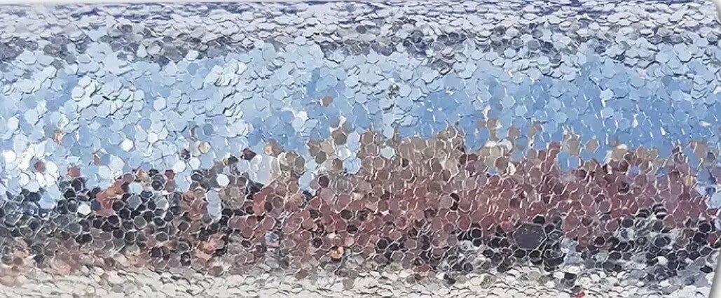 Sparkle Silver utgörs av ett tyg i imiterad skinn, belagd med större bitar av glitter i silver.