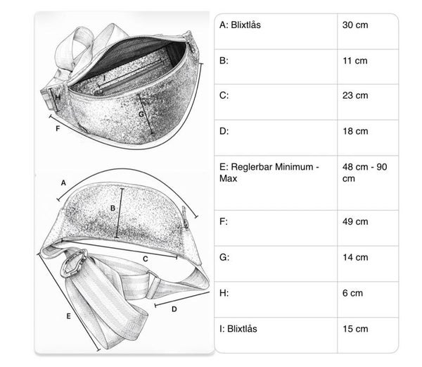 Ljuvlig och praktisk bumbag i vår klassiska modell, designad i ett exklusivt kombinationsmaterial av glitterbelagt fuskskinn med baksida i vattenavvisande tyg. En perfekt balans mellan statement och funktion – lika självklar till vardag som till fest.